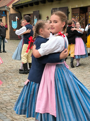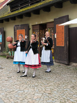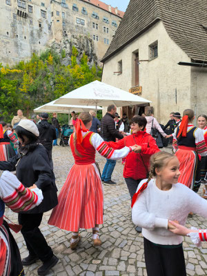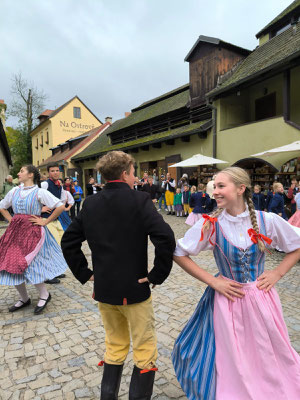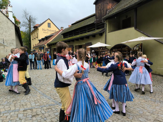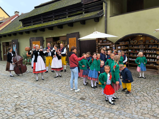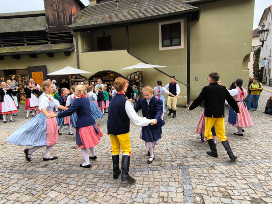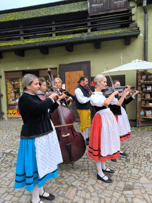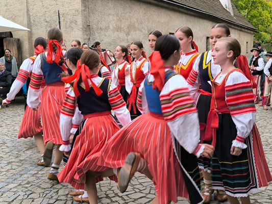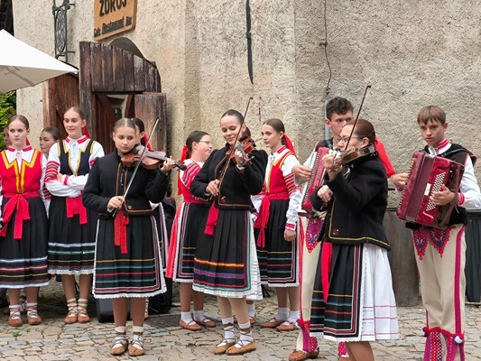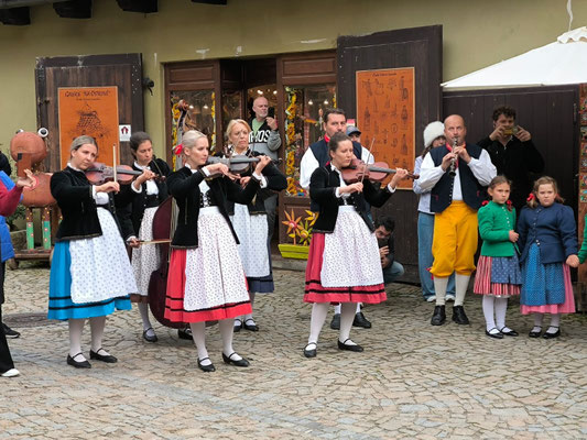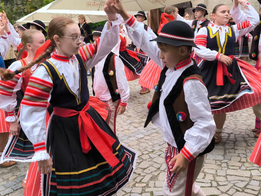 Denn auf einem kleinen Platz zeigen die verschiedenen Folkloregruppen ihr Können. Von ganz klein bis groß. Es wird gesungen und getanzt. Und auf Instrumenten werden die Tänzer begleitet. Was für eine wunderbare Stimmung!!! 🪗🪈