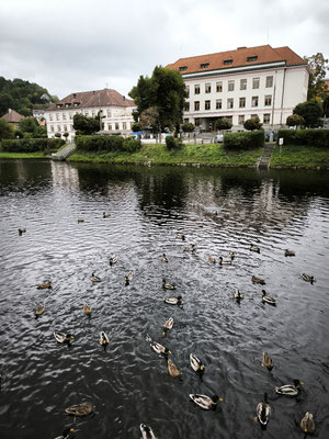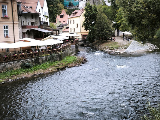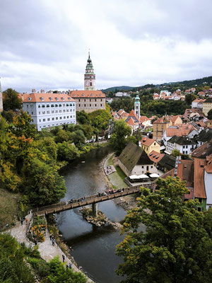 Durch die Altstadt windet sich in mehreren Schleifen die Moldau. Über Brücken gelangt man von einem Teil der Stadt in den anderen. 👍🚶🚶