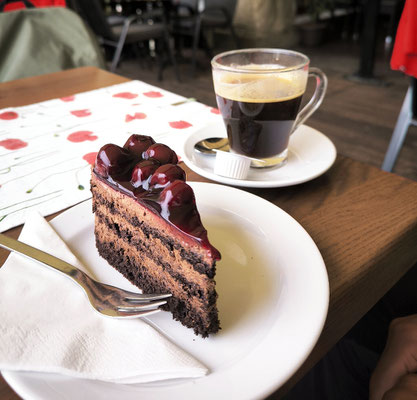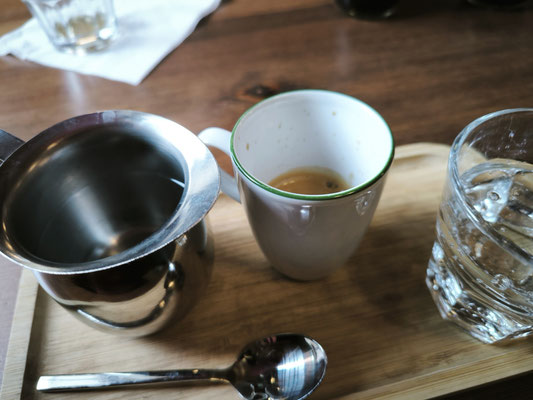 Der Kuchen war ausgezeichnet und in der Tasse war dieses Mal mehr drin, als sonst. 😜 Man bekommt  meistens heißes Wasser gereicht und kann sich den starken Kaffee dann verdünnen.