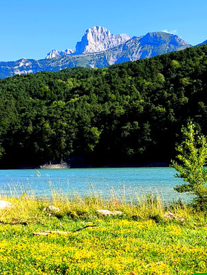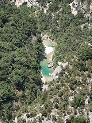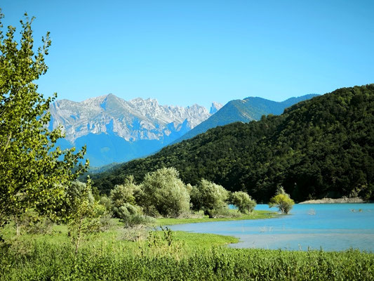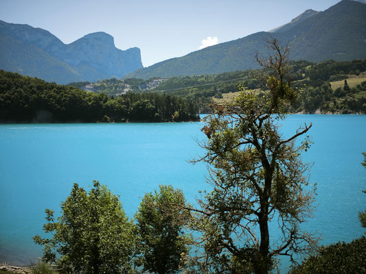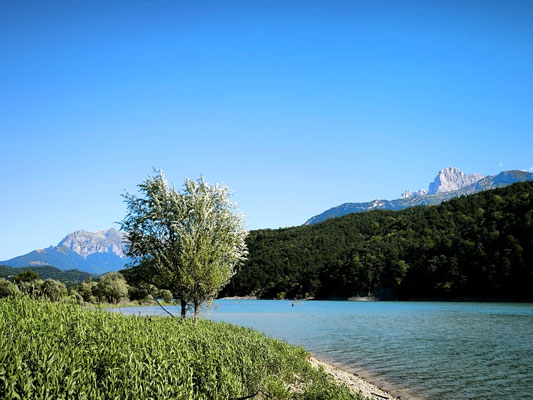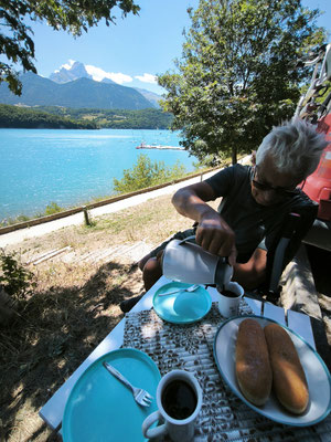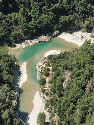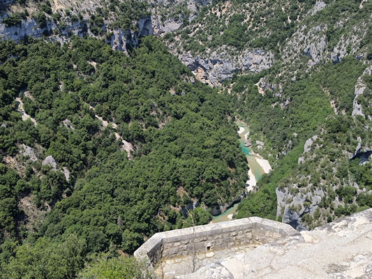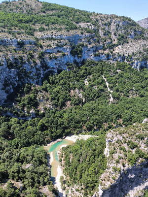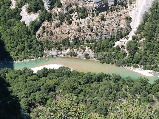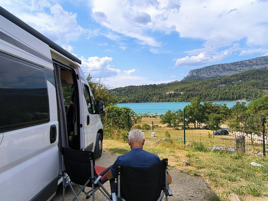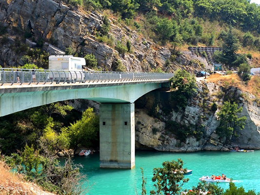 Der Fluss Verdon mündet hier im See. Damals im April schauten wir vom Aussichtspoint auf die Mündung und die Brücke. Jetzt stehen wir direkt davor.