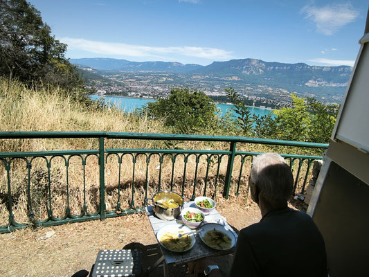 Heute morgen hatten wir kein Glück mit dem Campingplatz in Annecy, leider war alles belegt. Sind dann ein Stückchen weiter in Richtung Genf gerollt und standen in dem französischen Dörfchen Neydens an der Rezeption des dortigen Campingplatzes. Eine Übernachtung ohne Strom kostete 58,00 Euro. Das war uns zu "billig". 🙈