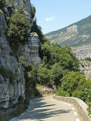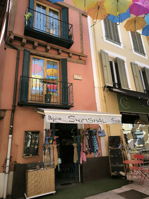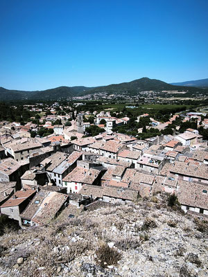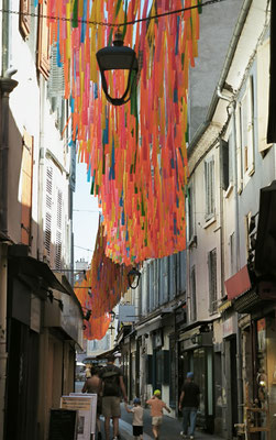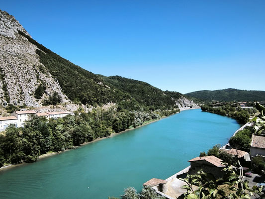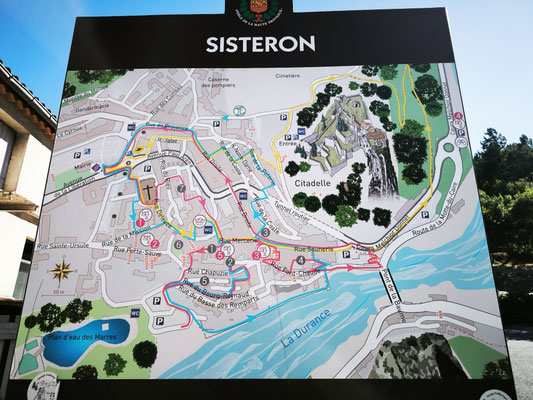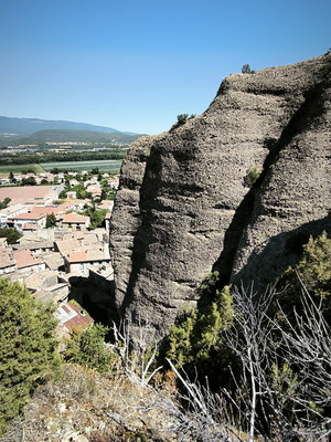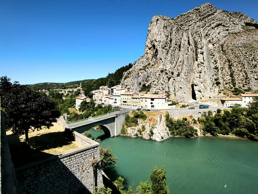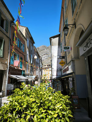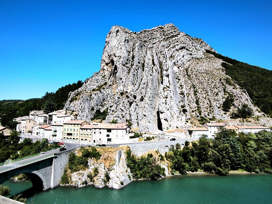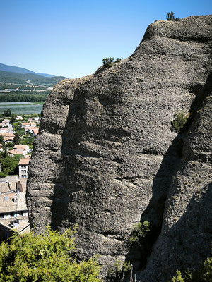 Wir fahren in Sisteron den öffentlichen Parkplatz an und bummeln - zum Glück im Schatten - die Ladenstraße entlang. Die endet genau dort, wo man den Blick zum großen berühmten Felsen hat.