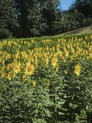 Zuerst kommen wir an mehreren hübschen Sonnenblumenfeldern vorbei und dann sehen wir noch eine V+E Station, wieder alles kostenlos.