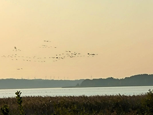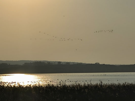 Am 9. und 10. Oktober gegen 18.30 Uhr fuhren wir noch einmal zum Galenbecker See und sahen doch tatsächlich tausende Kraniche im Anflug, die von ihren Futterplätzen kamen. Was für ein erhebendes Gefühl das war, kann man kaum beschreiben. Man muss es erlebt haben.